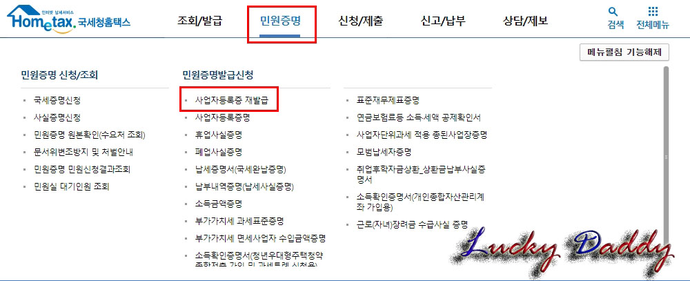 홈택스 메뉴에서 [민원증명]-[사업자등록증 재발급]을 클릭해주세요.