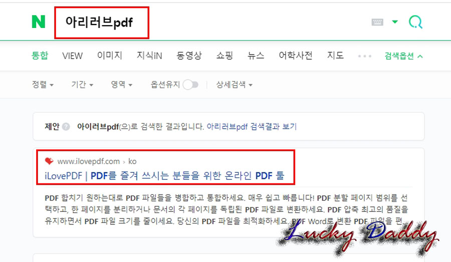 네이버 검색창에 “아리러브pdf”라고 입력을 하면 제일 먼저 나오는 “iLovePDF”라고 보입니다.