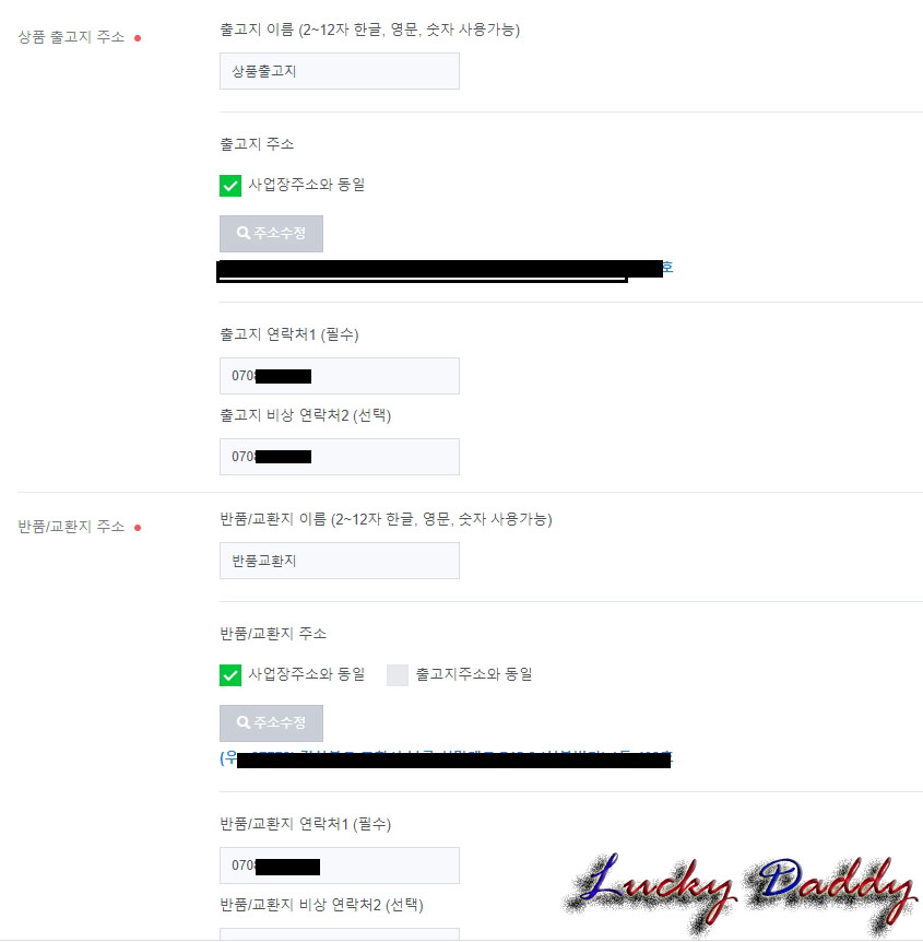상품 [출고지 주소]와 [반품/교환지 주소]는 건들 것 없이 그냥 나온대로 두시구요.