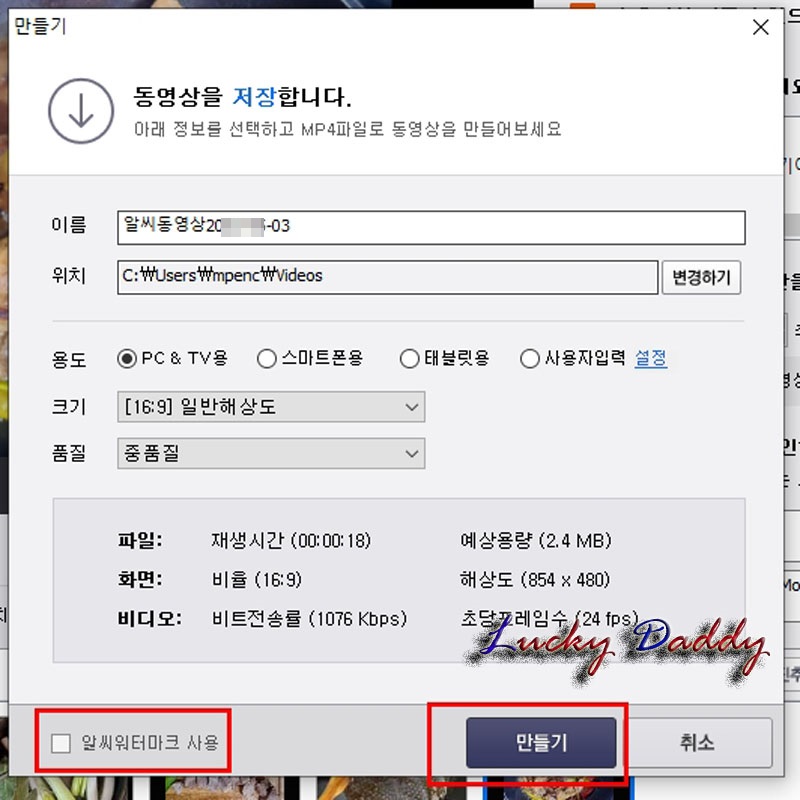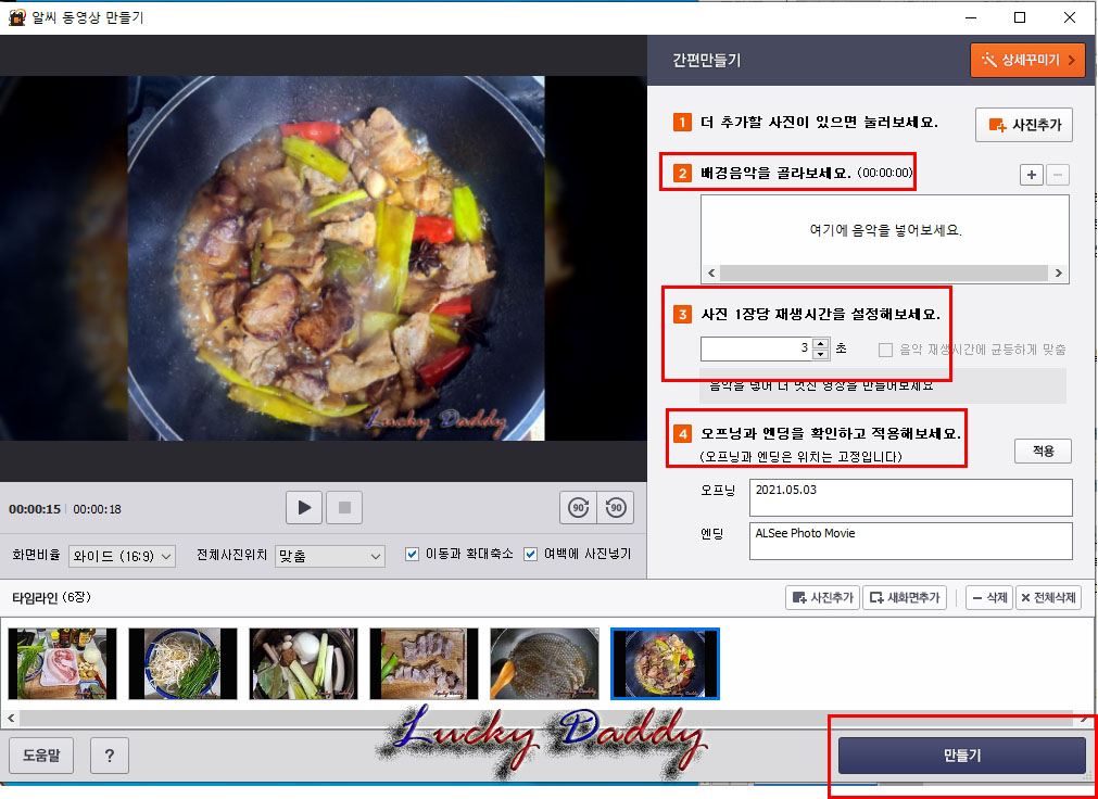 사진 1장당 재생시간을 설정 할 수도 있고 설정을 한 후 아래 [만들기]버튼을 클릭해 주세요.