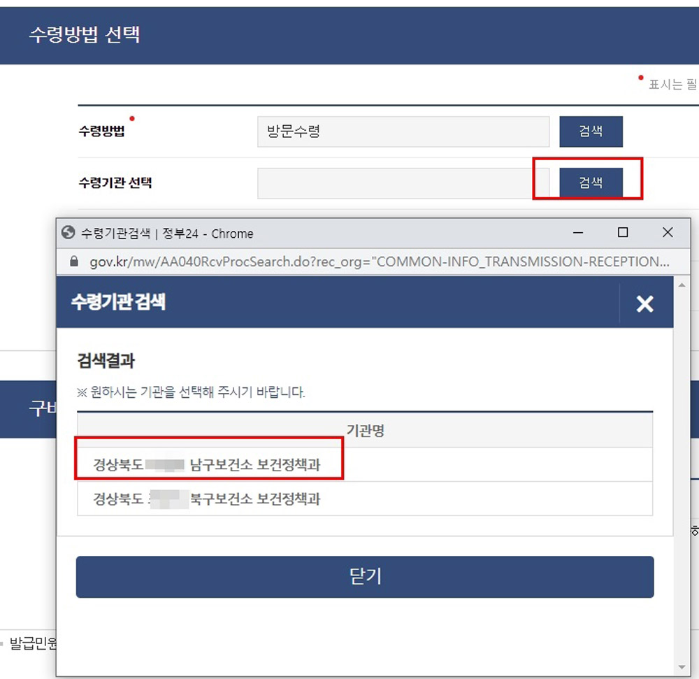 [수령기관]도 [검색]을 클릭 후 자신이 원하는 장소의 텍스트를 클릭해주세요.