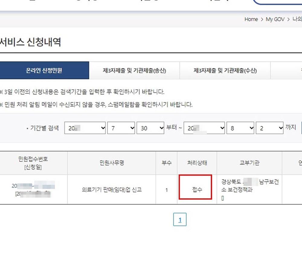 금방 신청한 내역이 “접수”상태로 나옵니다.