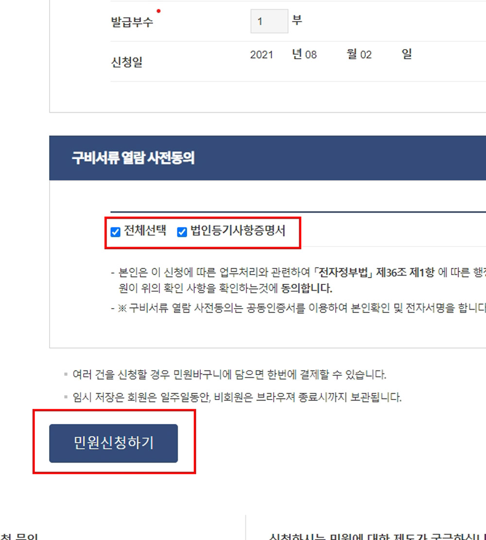 [구비서류 열람 사전동의]에서 “전체선택” 과 “”법인 등기사항 증명서“에 모두 체크를 하고,