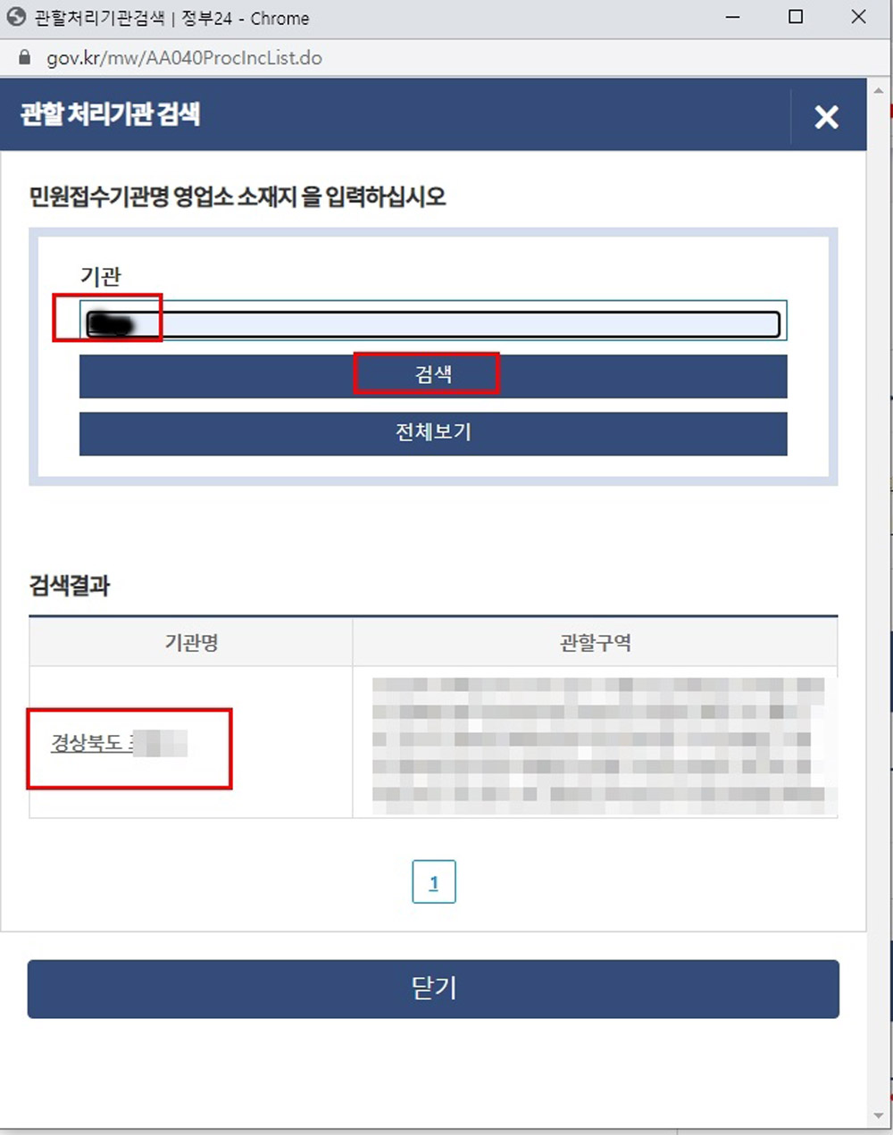 민원접수기관 우측의 [검색]을 클릭해주세요.