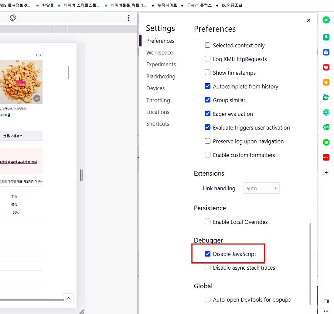 아래로 스크롤을 내려보면[Debugger] 의[Disable JavaScript]왼쪽의 작은 사각형에 체크를 해주세요.