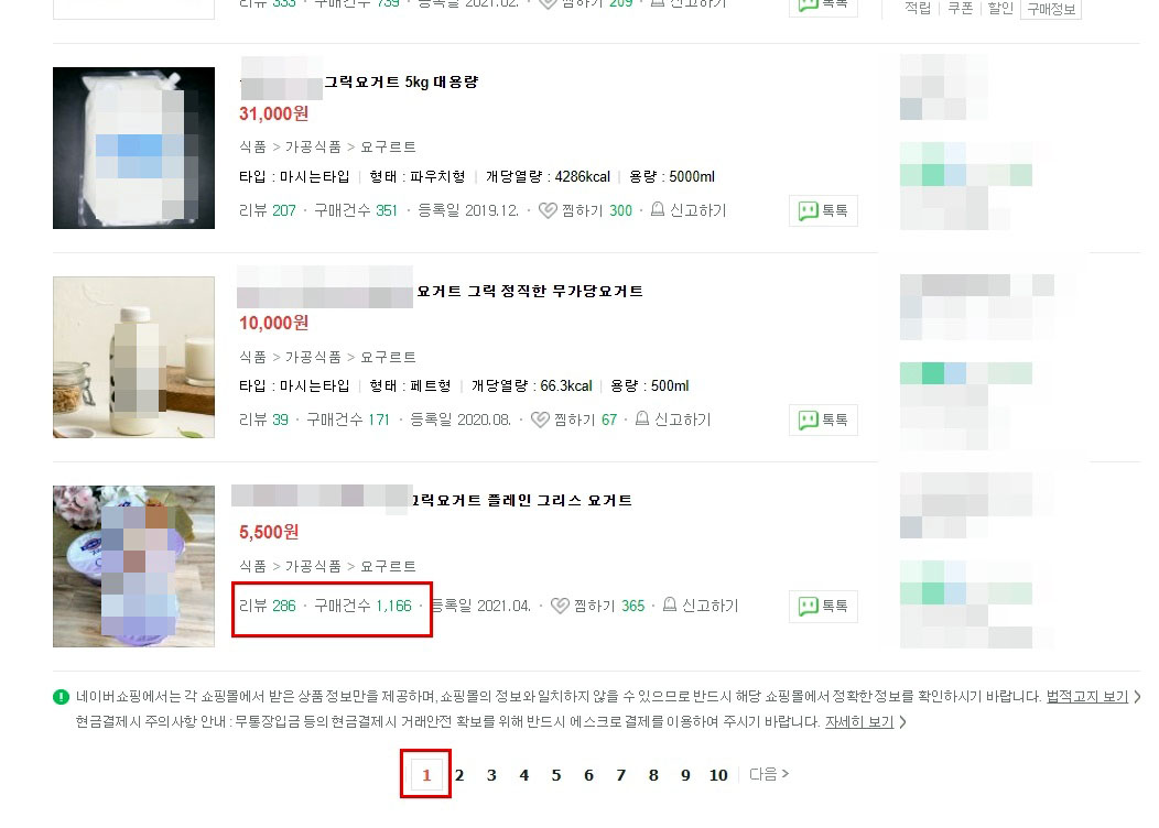 아래 쭉 나온 상품 중에 광고를 제외하고 상위 상품의 리뷰수와 구매건수를 봐주세요.