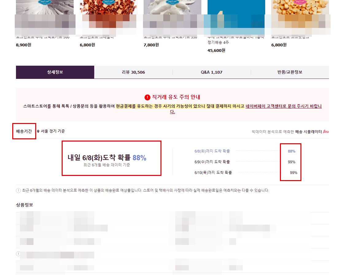 분명 아까는 상세페이지 아래 [배송기간]에 “내일 6/8(화) 도착확률 88%”라는 문구만 보였는데,