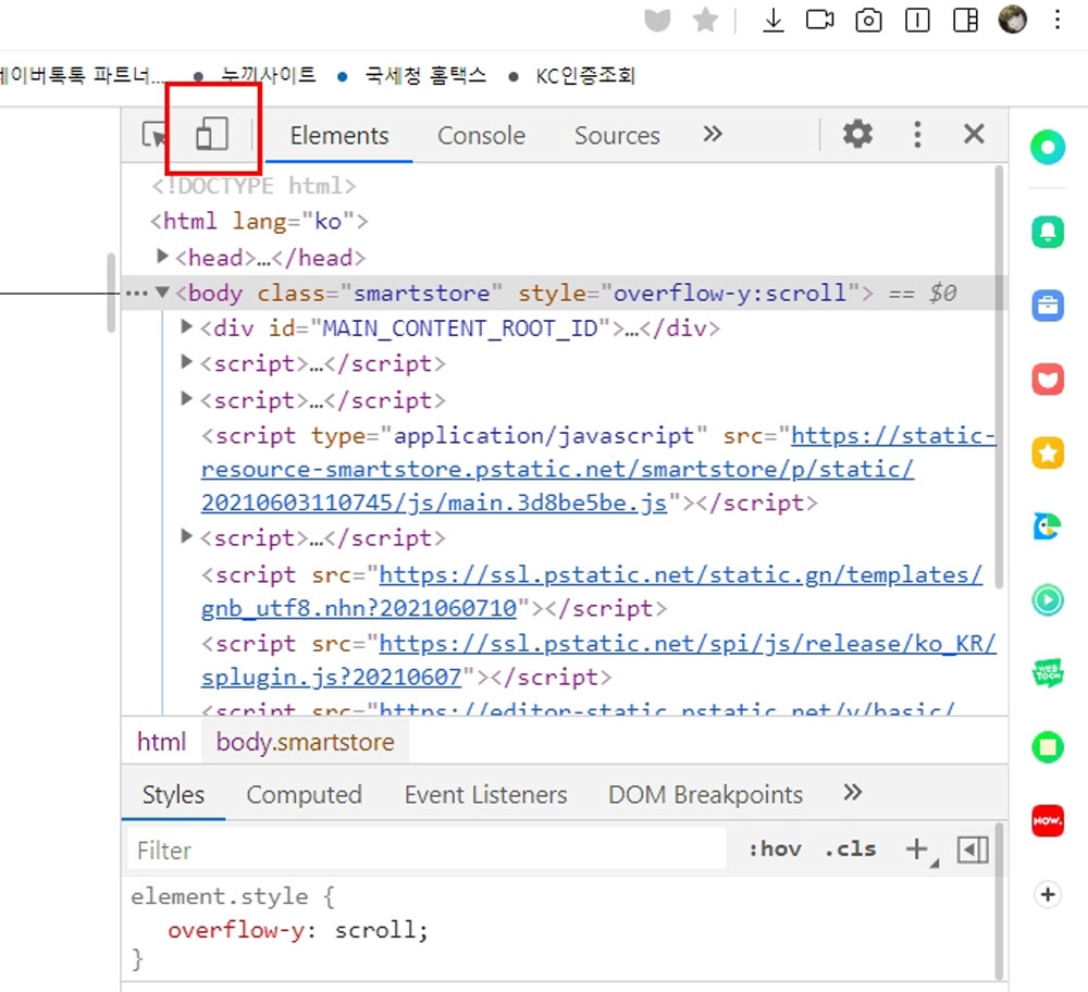 소스창 좌측 상단의 [모바일 아이콘]을 클릭해주세요.