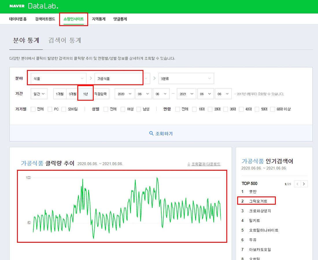 어떤 상품이 요즘 인기가 많은지 알아보기 위해 [네이버 데이터랩]의 [쇼핑인사이트]에 접속해서 분야에 1분류를 [식품], 2분류를 [가공식품]으로 선택하고 기간을 [1년]으로 선택 후 조회를 실시간으로 해보았습니다.