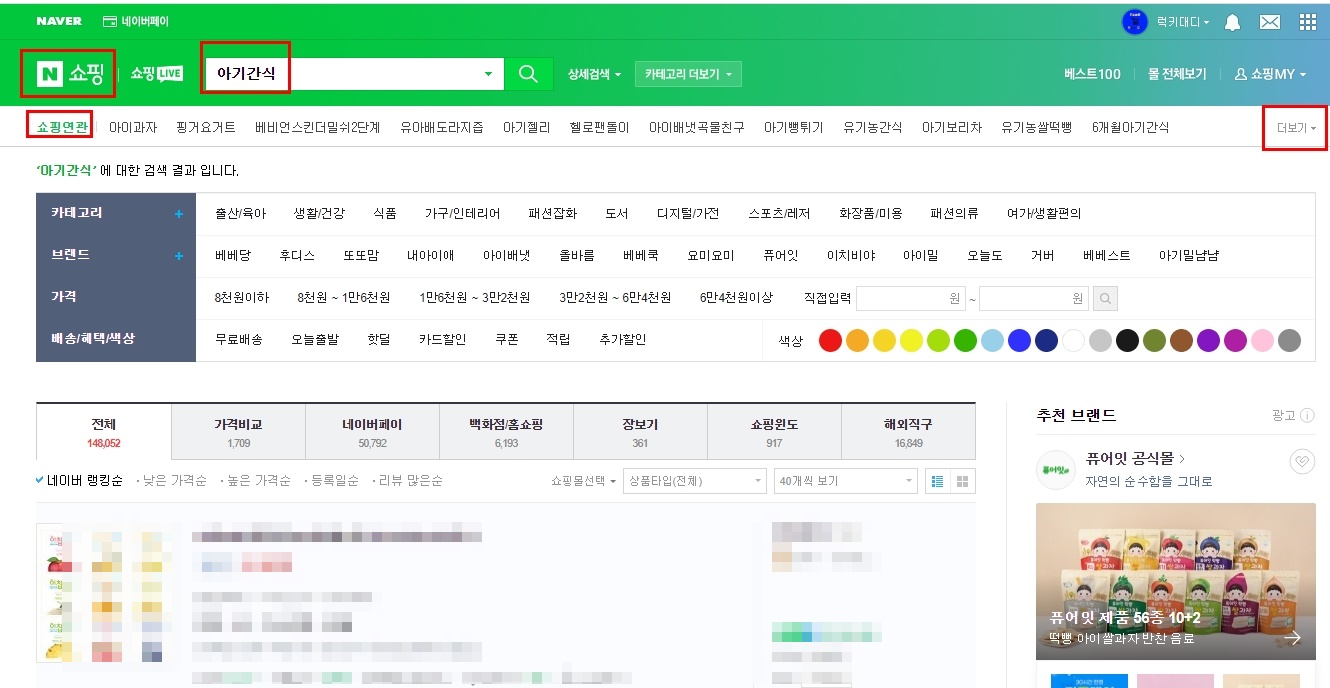 네이버 쇼핑에 접속해서 ‘아기간식’을 입력하고 검색하고 아래 [쇼핑연관]이라는 부분의 우측에 [더보기를]클릭해주세요.