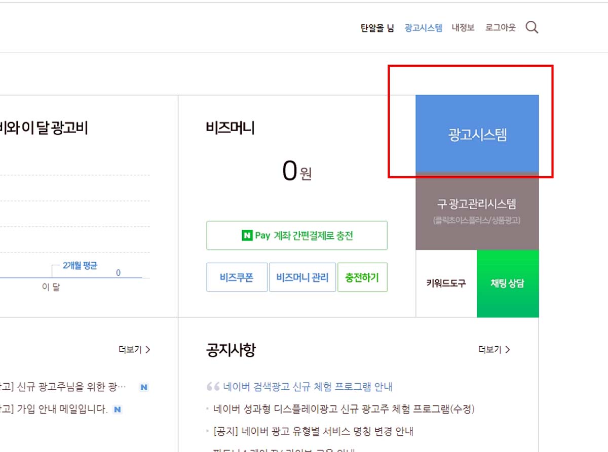 네이버 검색광고에 로그인을 한 후 [광고시스템]을 클릭해주세요.