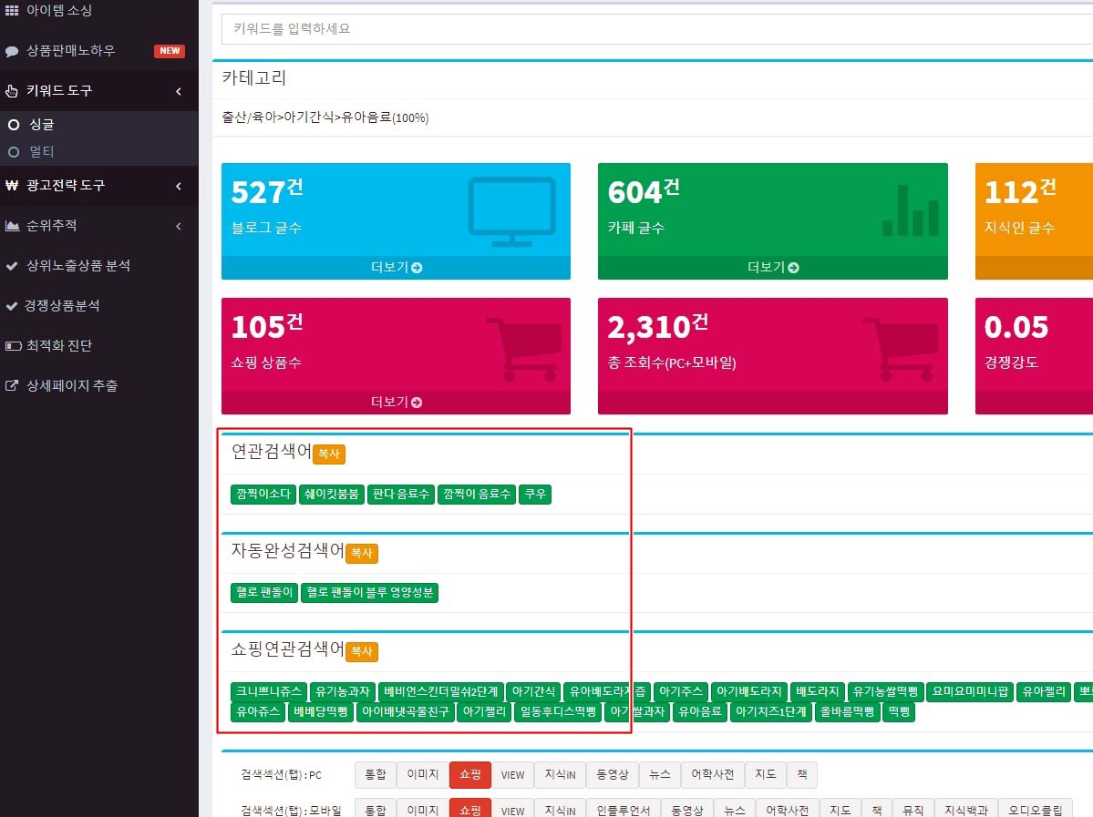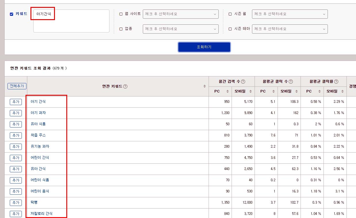 좌측메뉴에서 [키워드 검색]을 클릭하면 우측에 ‘아기간식’으로 검색을 하면 아래 연관 검색어가 쫙 나옵니다.