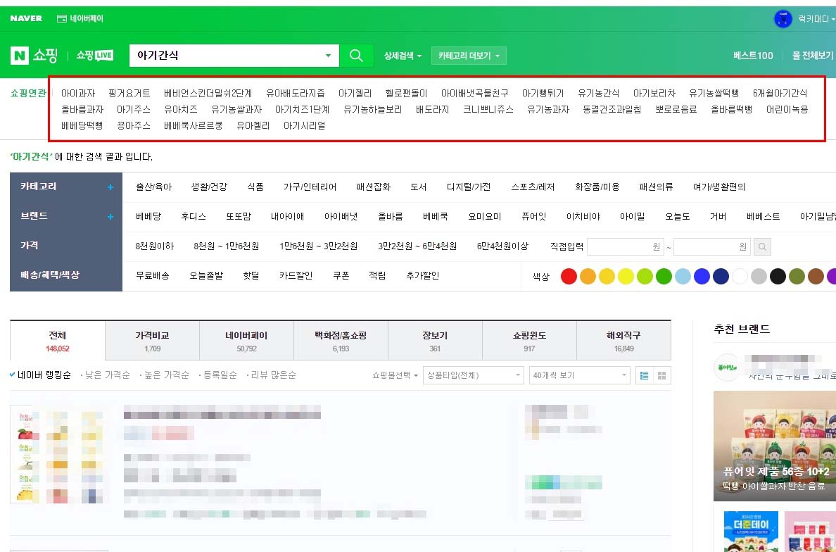 키워드에 ‘아기간식’이라고 입력하니 아래 연관 키워드가 쭉 나옵니다.