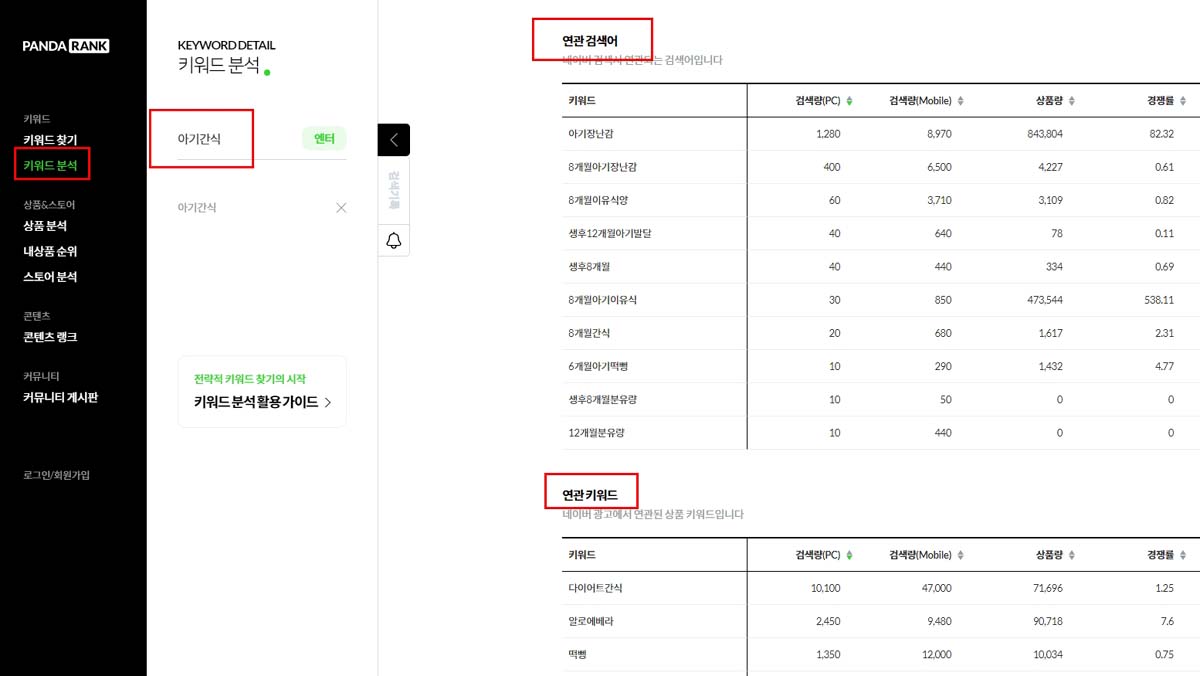 좌측메뉴에서 [키워드 분석]을 클릭하면 우측에 ‘아기간식’으로 검색을 하면 우측 창에 연관 키워드가 쭉 나옵니다.