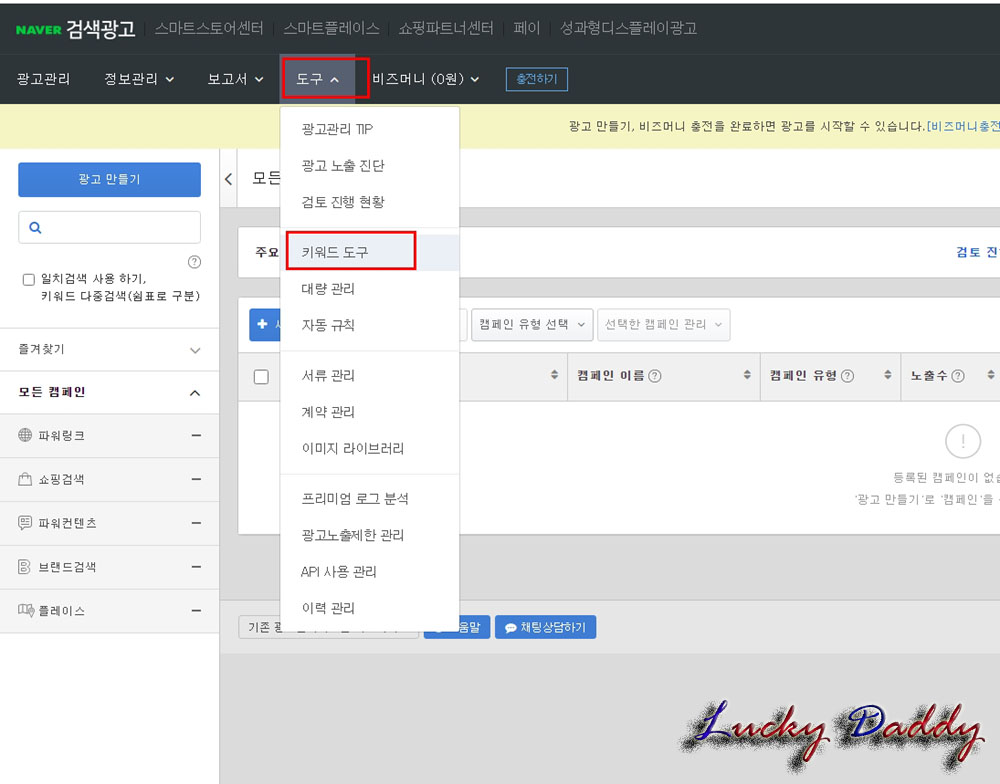 처음 나오는[광고관리]는 광고를 만들 때 사용하는 탭 이구요 4번째 있는 [도구]-[키워드 도구]탭을 클릭해주세요.