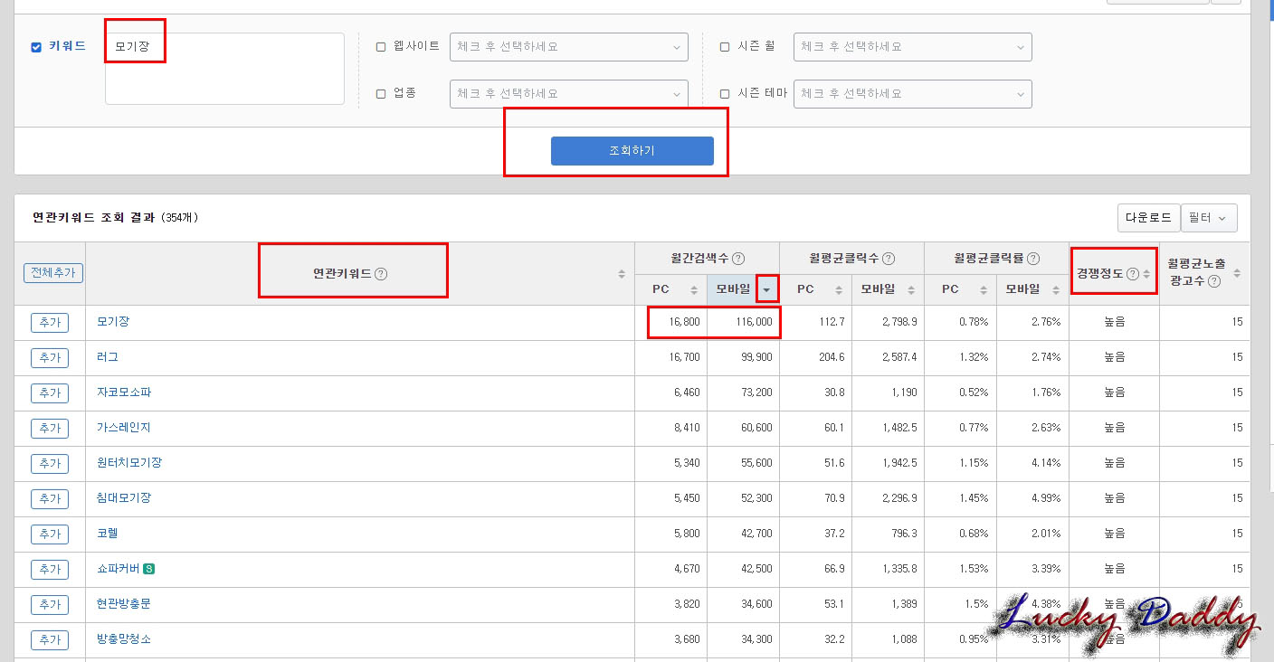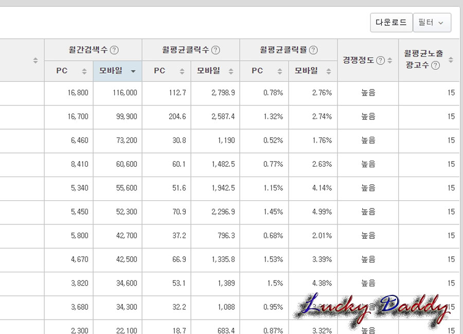여기서 모바일이 월등히 많으니 정렬을 모바일 검색수가 많게 세모화살표를 클릭해줍니다.
