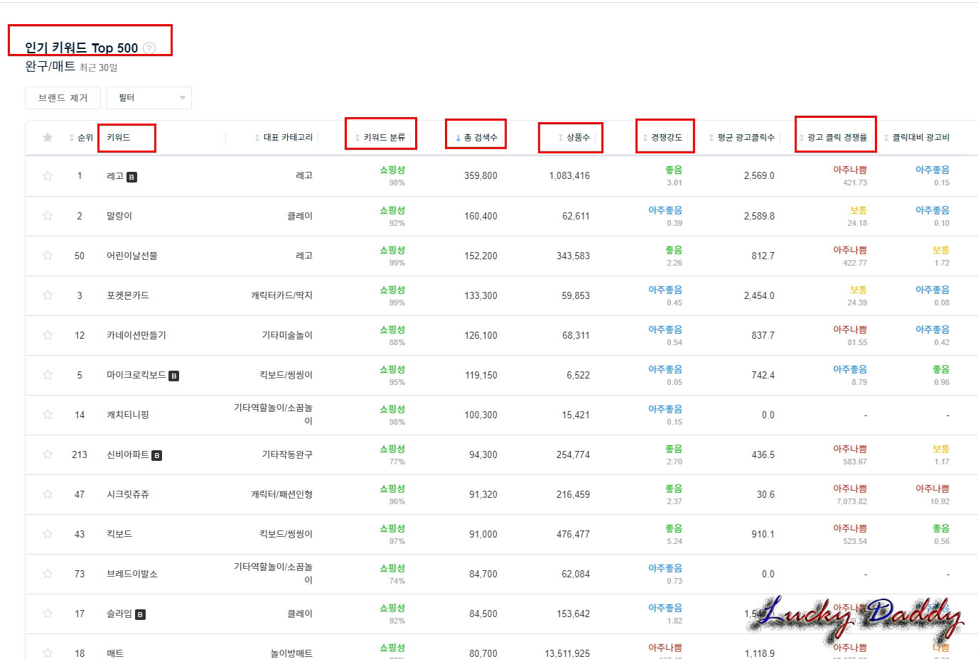 그 아래로 내려 보면 [인기 키워드 TOP 500]이 나옵니다.