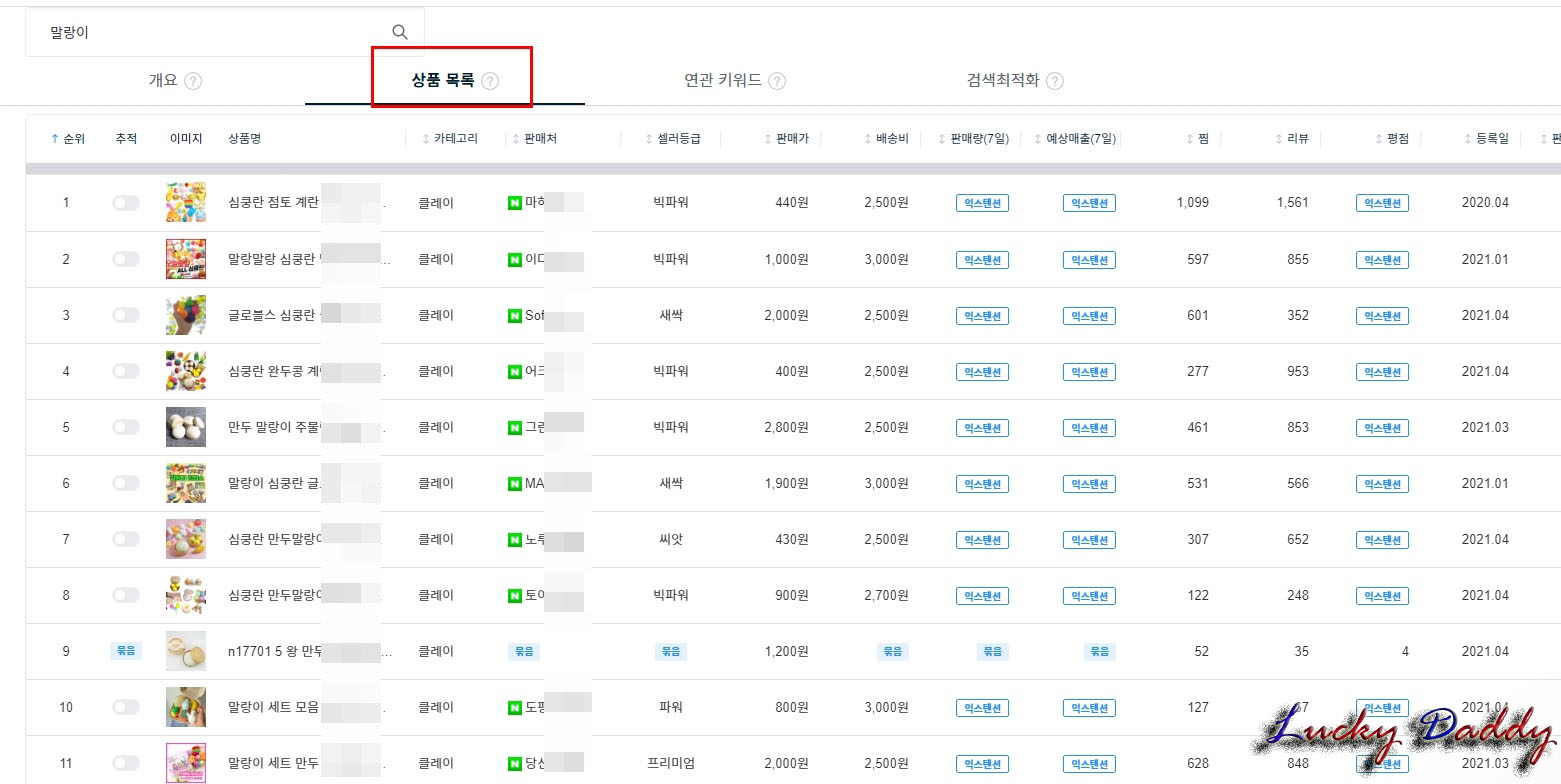 다음 두 번째 탭인 [상품목록]을 클릭해 보니 ‘말랑이’를 팔고 있는 마켓이 쫘르르 나옵니다.