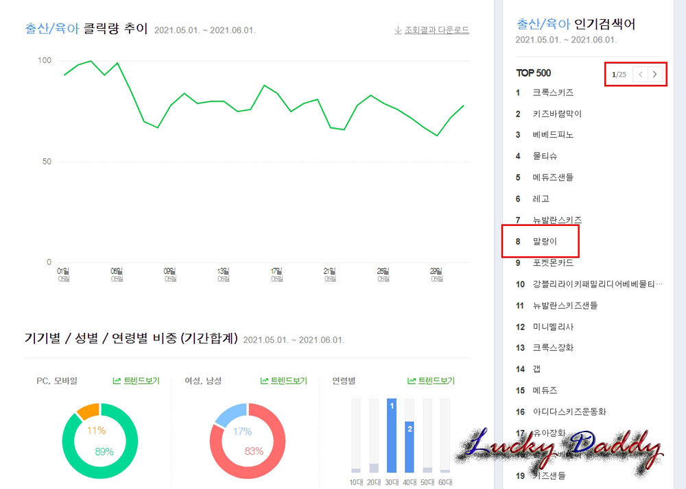 전 시간 에이버 데이터랩 [쇼핑 인사이트]에서 설명드릴 때 [출산/육아]로만 설정하고 검색했을 때 우측의 인기 검색어 TOP500에 8위가 ‘말랑이’였습니다.