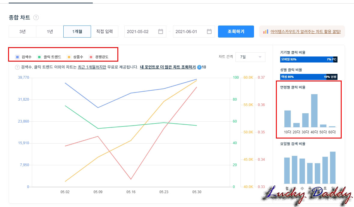 챠트는 내가 선택한 기간 동안 검색수, 클릭수, 상품수, 경쟁강도를 알기 쉽게 한 눈에 볼 수있습니다.
