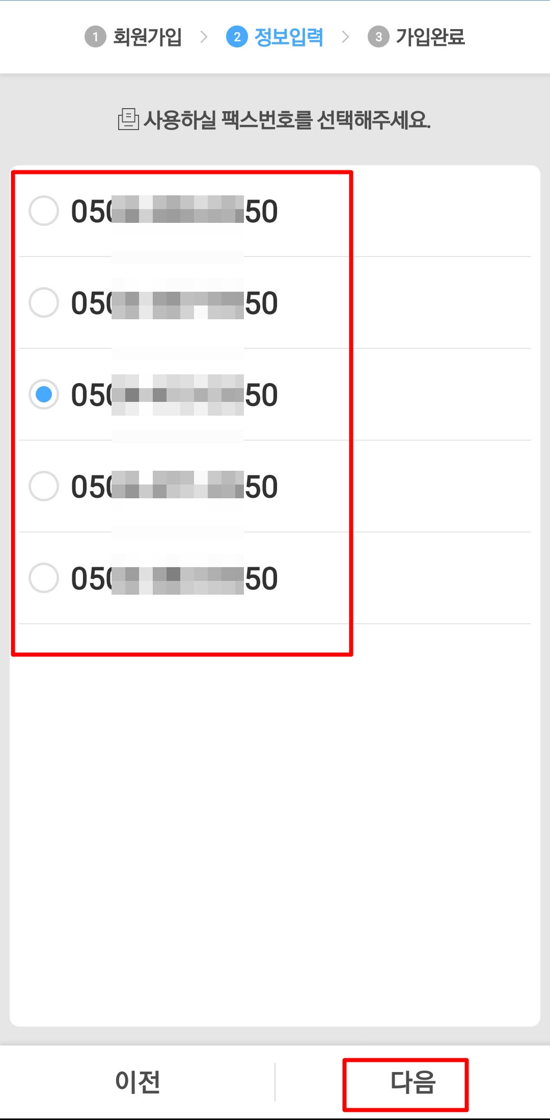 자신이 사용할 팩스번호를 선택해주세요.