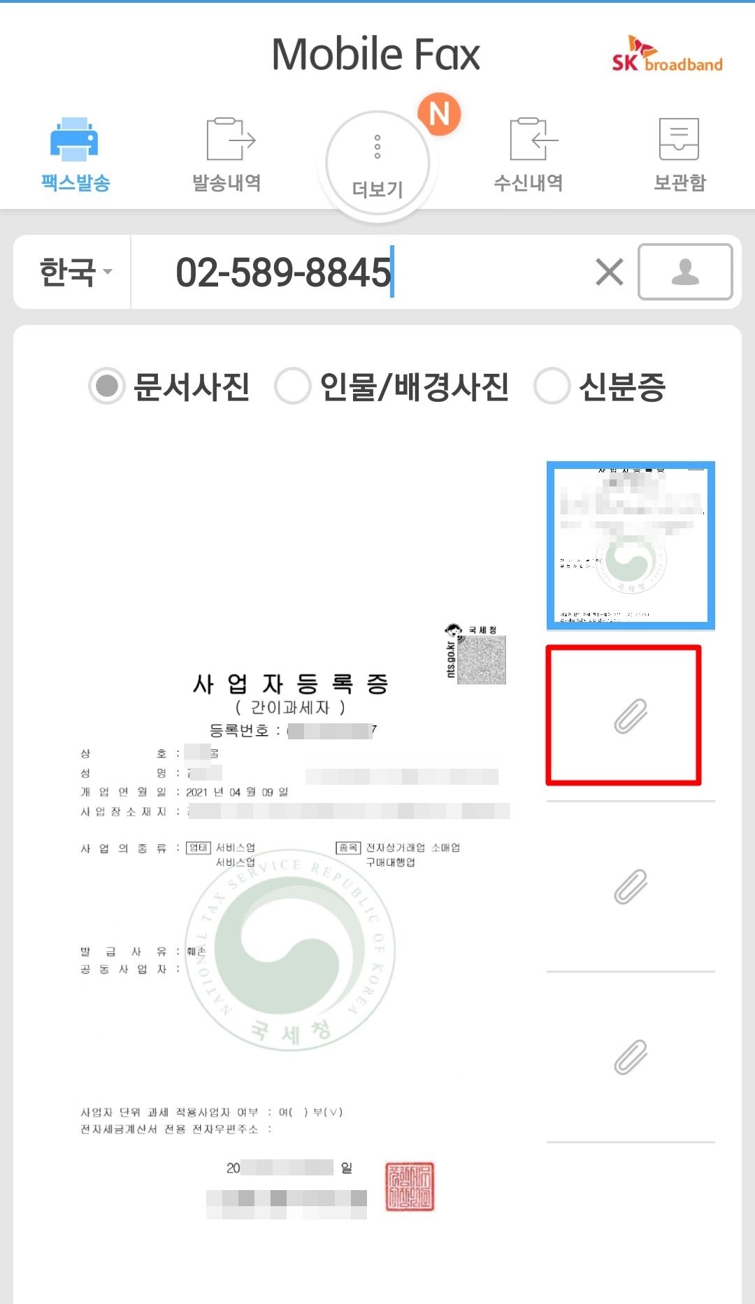 저 같이 여러장의 문서를 보낼때는 우측의 클립모양을 클릭해주세요.