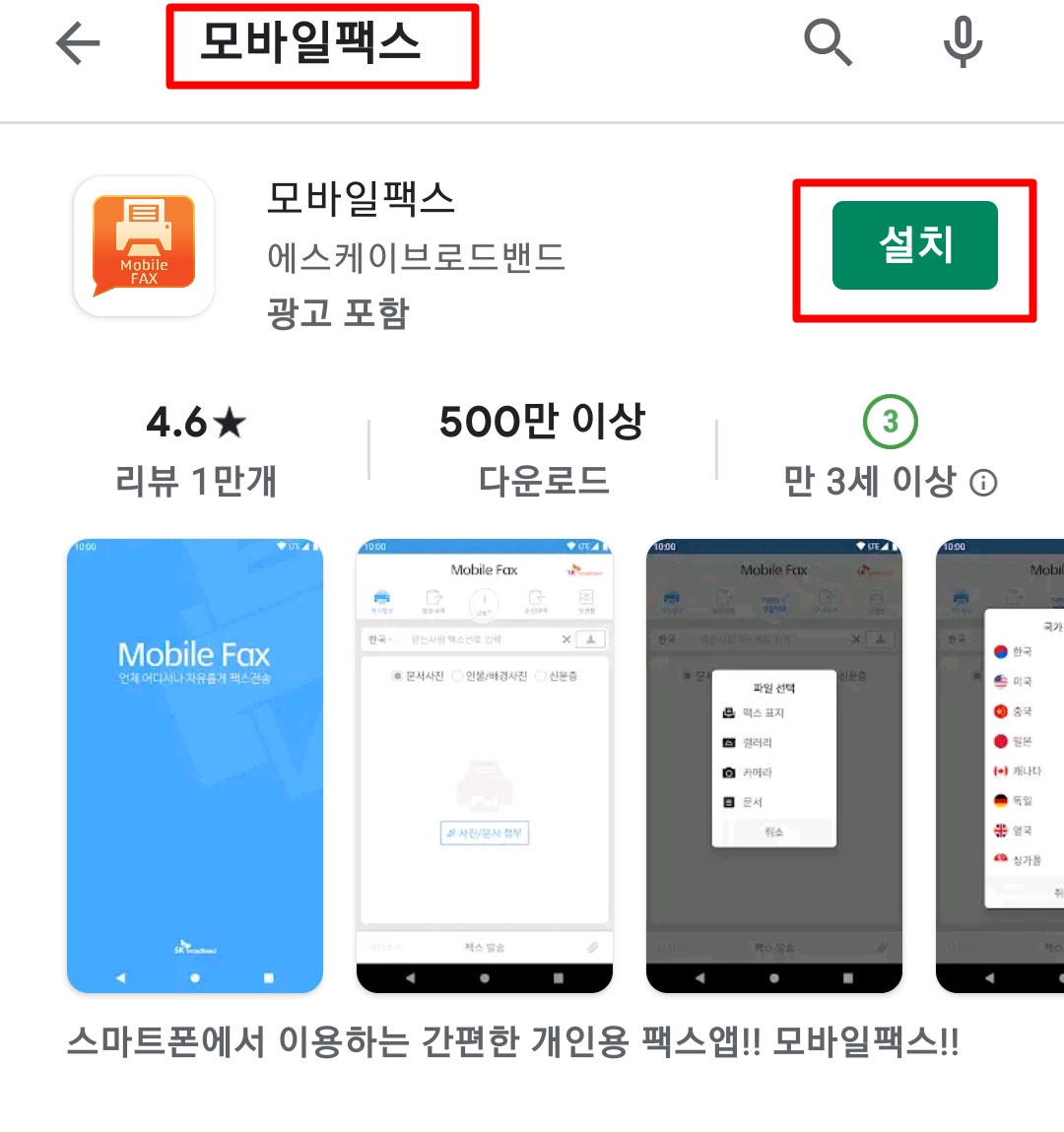 먼저 핸드폰에서 [Play스토어]에 접속 한 후 “모바일팩스”라고 입력한 후 검색해 설치해주세요.