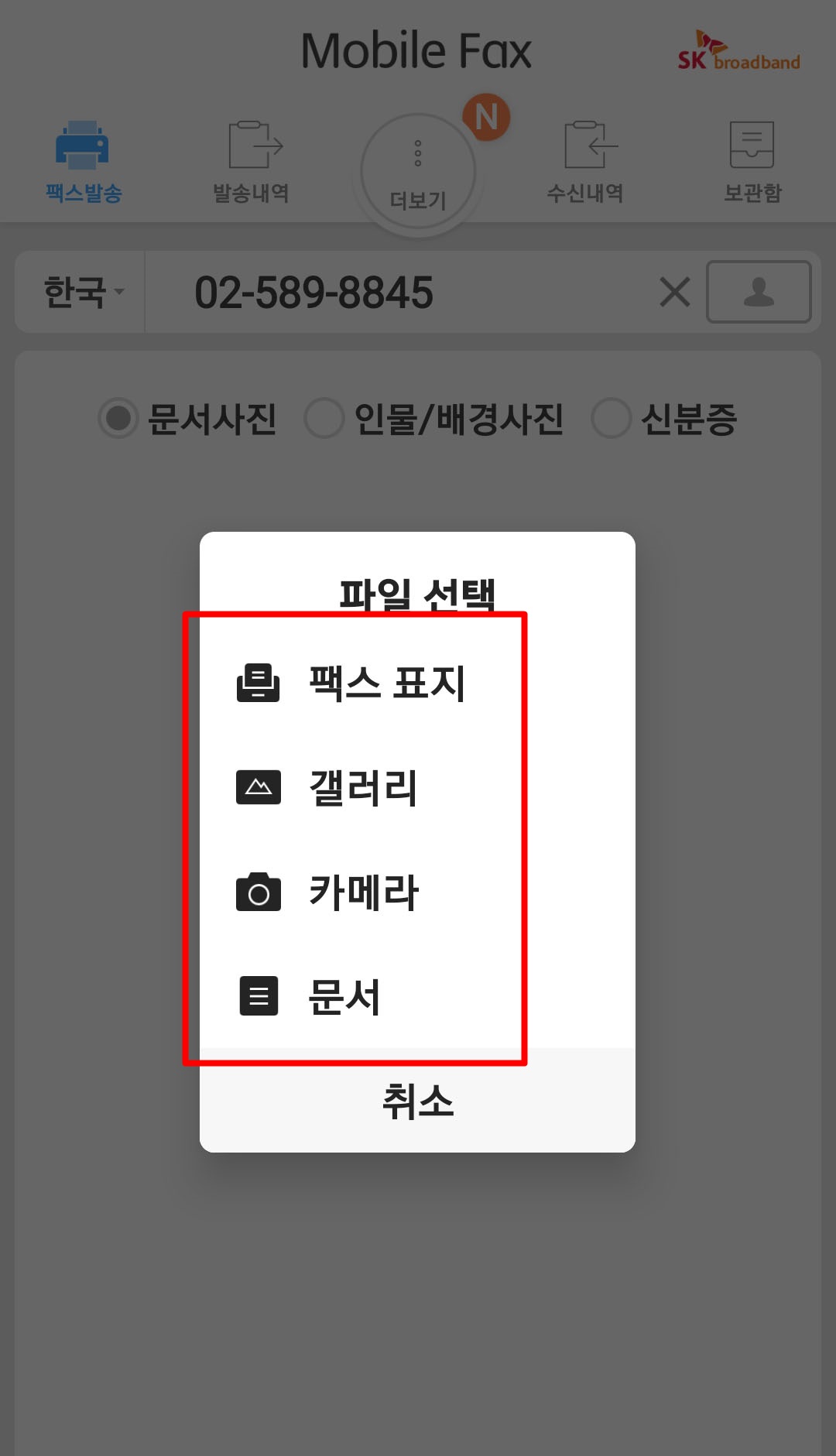 팩스보내기 전에 자신이 보내고자하는 문서를 핸드폰에 미리 저장해 두시는게 편합니다.