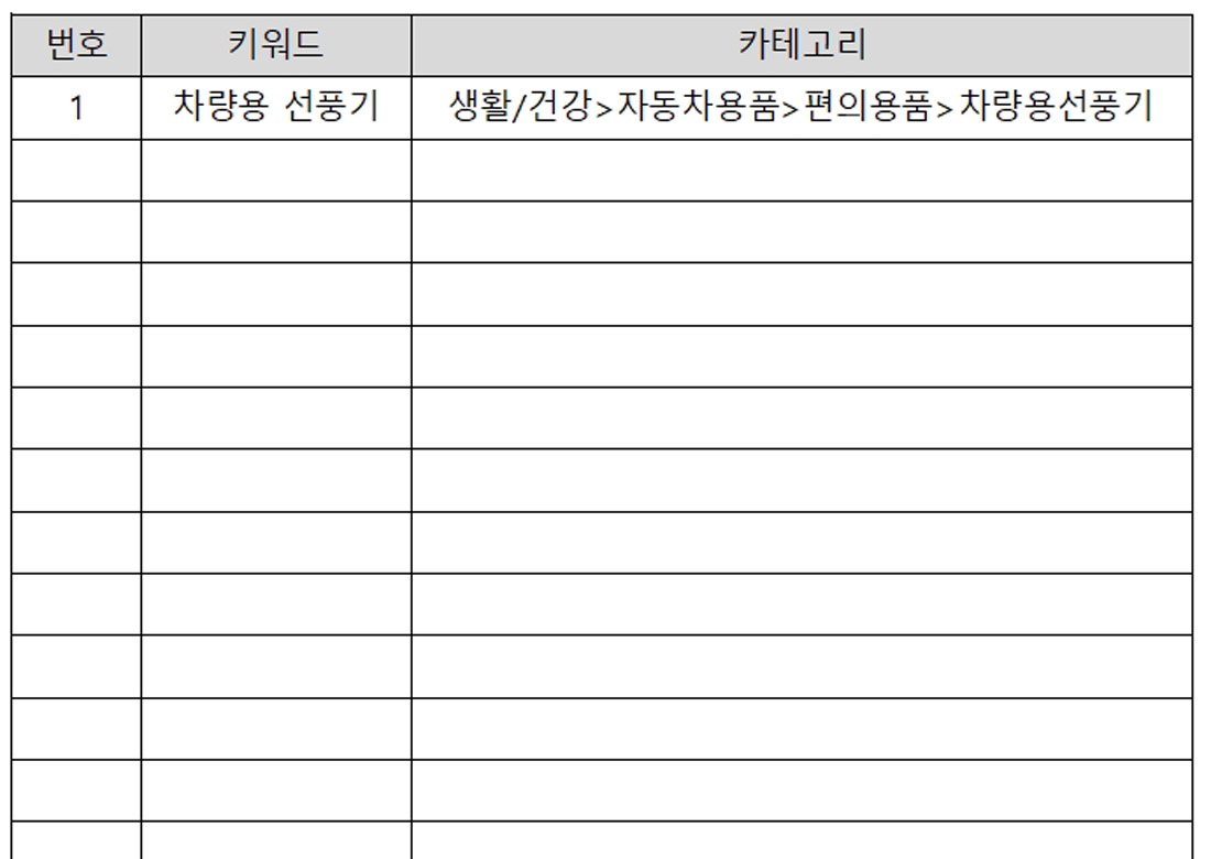 설명의 이해를 돕기 위해 이것을 엑셀에 [번호][키워드][카테고리]정도의 내용이 들어가도록 파일을 만들어 정리해볼게요.