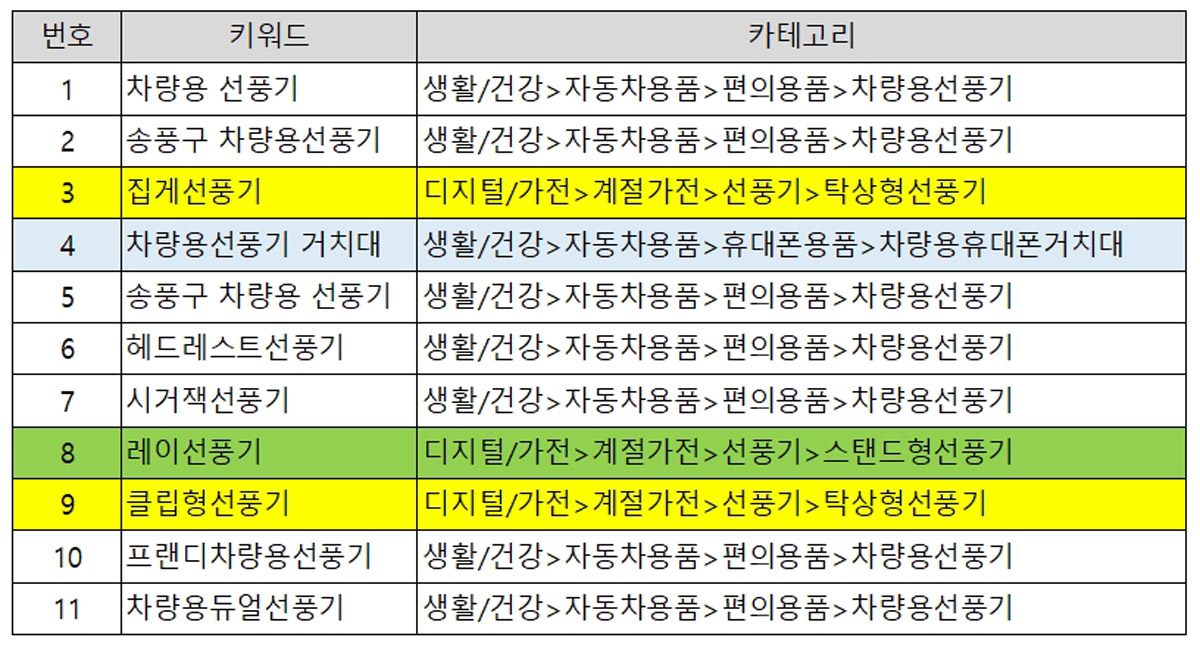 위의 3번의 ‘집게선풍기’라는 키워드와 9번의 ‘클립형 선풍기’라는 키워드의 카테고리가 [디지털/가전>계절가전>선풍기>탁상형 선풍기]로 동일합니다.