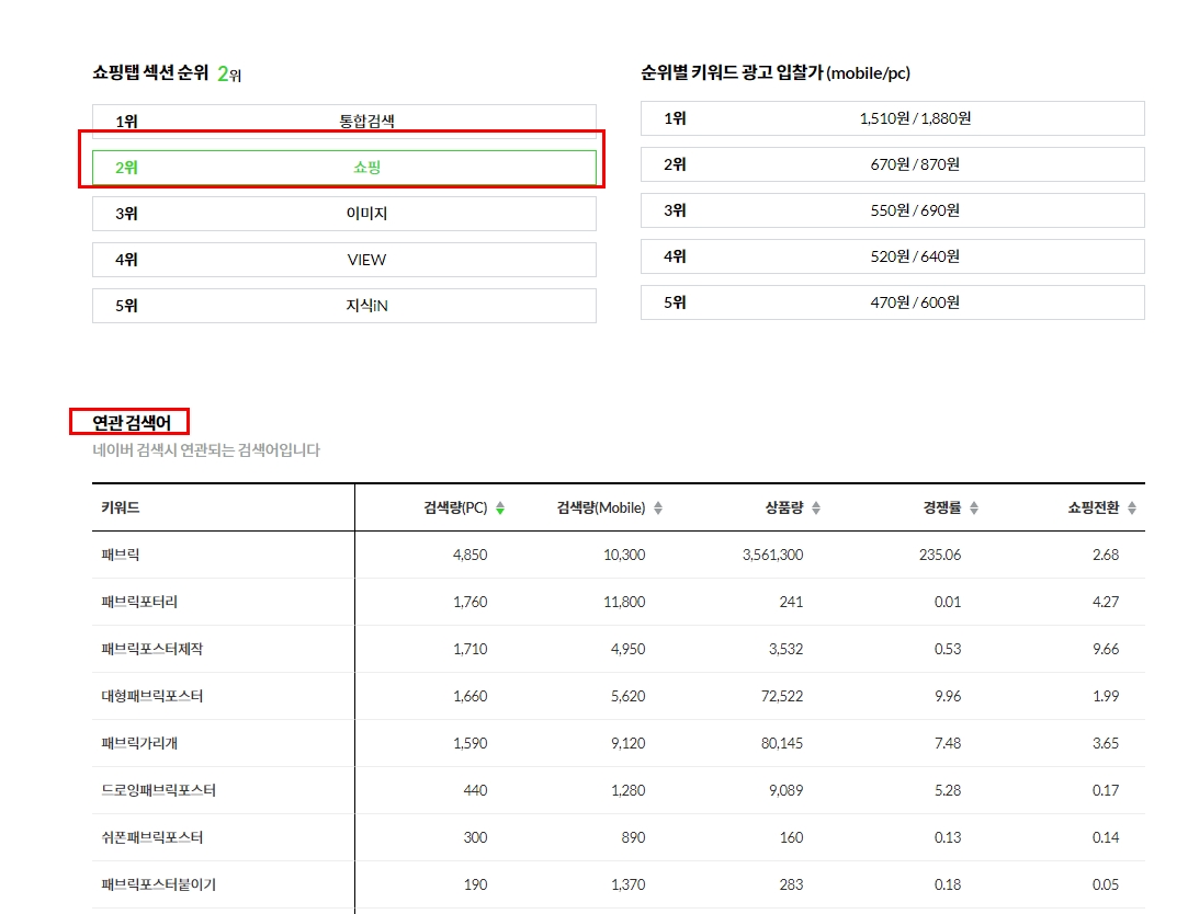 그 아래로 내려 보니 네이버에 ‘패브릭포스터’라고 검색했을 때 [쇼핑탭]이 2위라고 나옵니다.