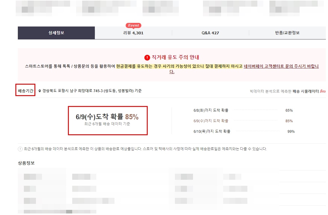 분명 아까는 상세페이지 아래 [배송기간]에 ‘이 제품이 6월 9일에 도착할 확률이 85%’라는 문구만 보였는데,