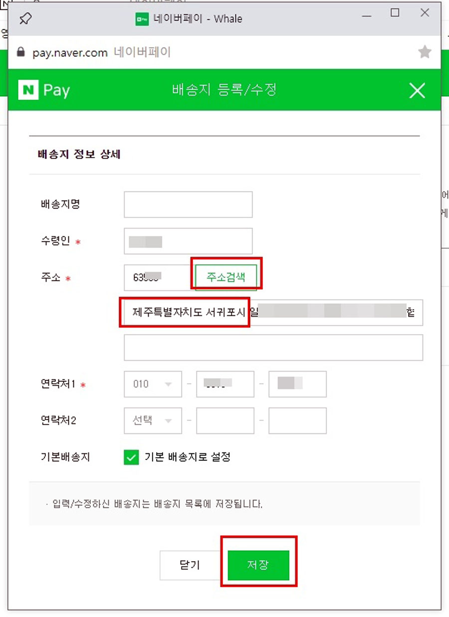 그리고 아래 기본배송지로 설정에 체크하고 [저장]을 누릅니다.