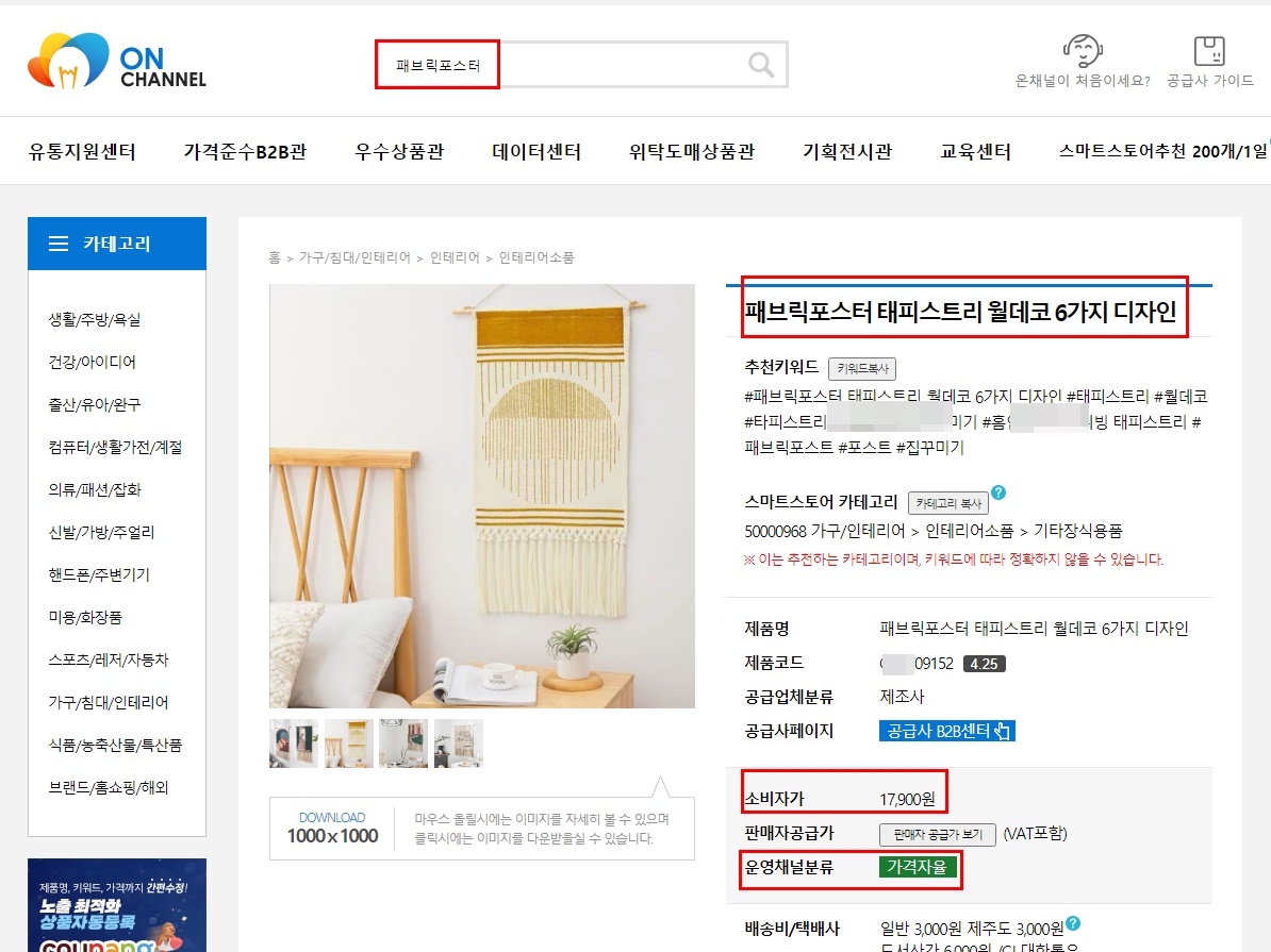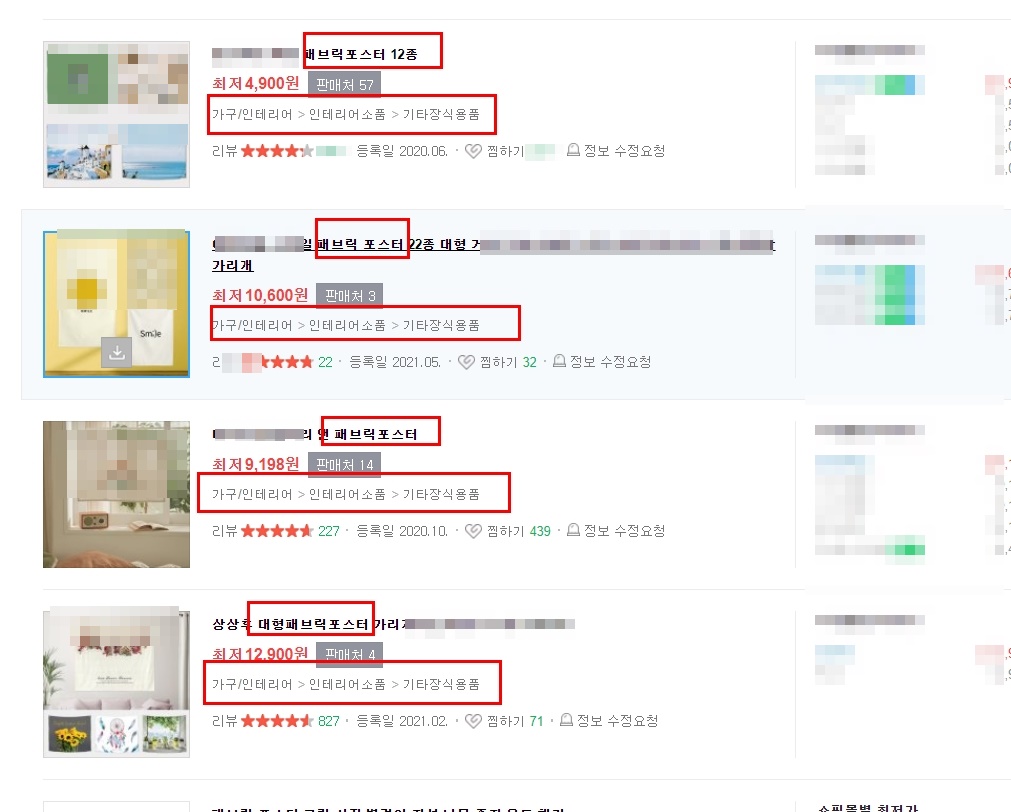 위 사진을 보니 대표 키워드인 ‘패브릭 포스터’의 카테고리는[가구/인테리어/인테리어소품/기타장식용품]로 되어 진 것을 볼 수 있습니다.