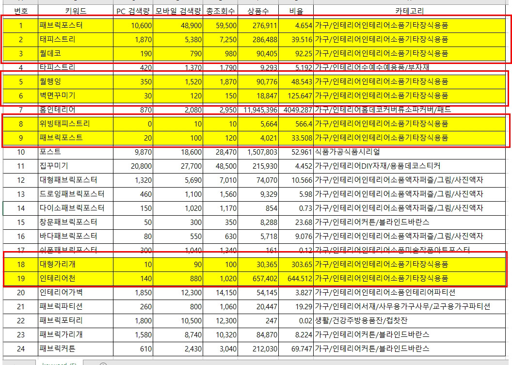 그럼 [가구/인테리어/인테리어소품/기타장식용품] 카테고리와 일치하지 않는 나머지 키워드는 아깝더라도 모두 행 삭제를 해주세요.