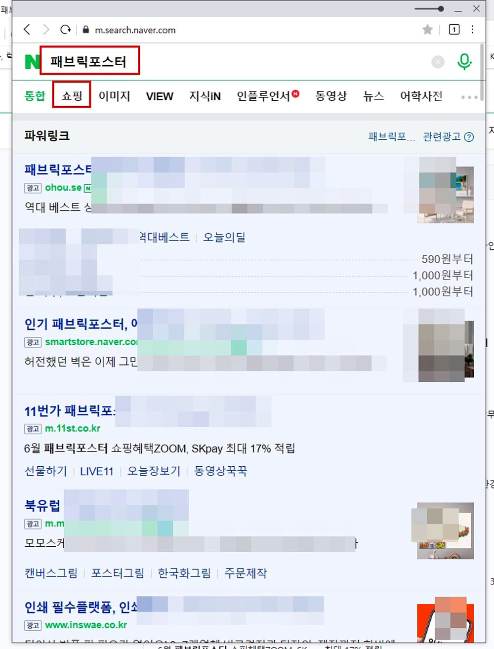 모바일 창으로 검색해도 [쇼핑탭]이 두 번째 나옵니다.