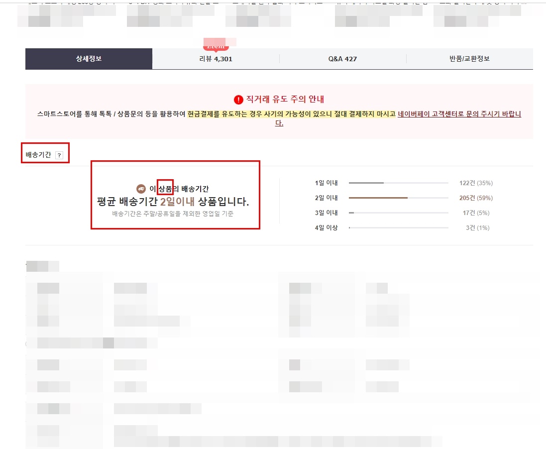 이제는 그 문구는 사라지고 대신 ‘이 상품의 배송기간, 평균 배송기간 2일 이내 스토어입니다“ 라고 나옵니다.