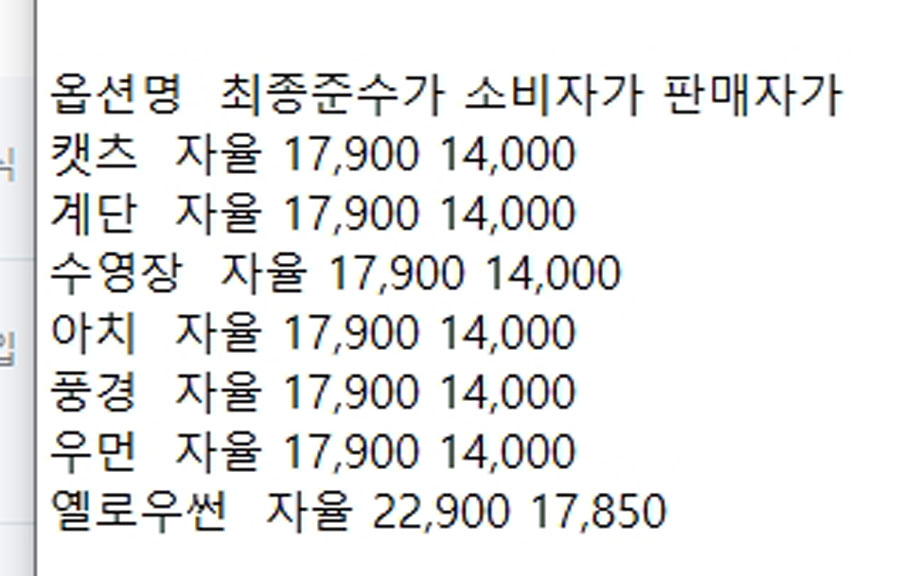 마지막 옵션 제품이 가격이 다른 옵션과 다릅니다.