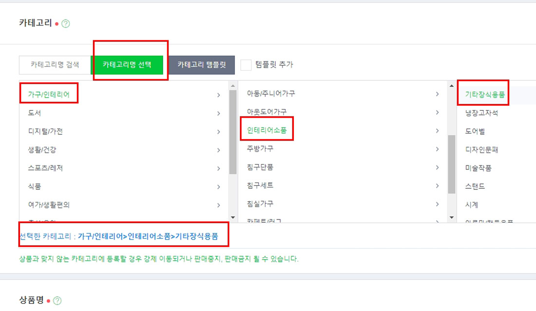 우리는 이미 전 시간에 카테고리 매칭을 통해 찾은 카테고리인 [가구/인테리어/인테리어소품/기타장식용품]를 차례로 선택해 주세요.
