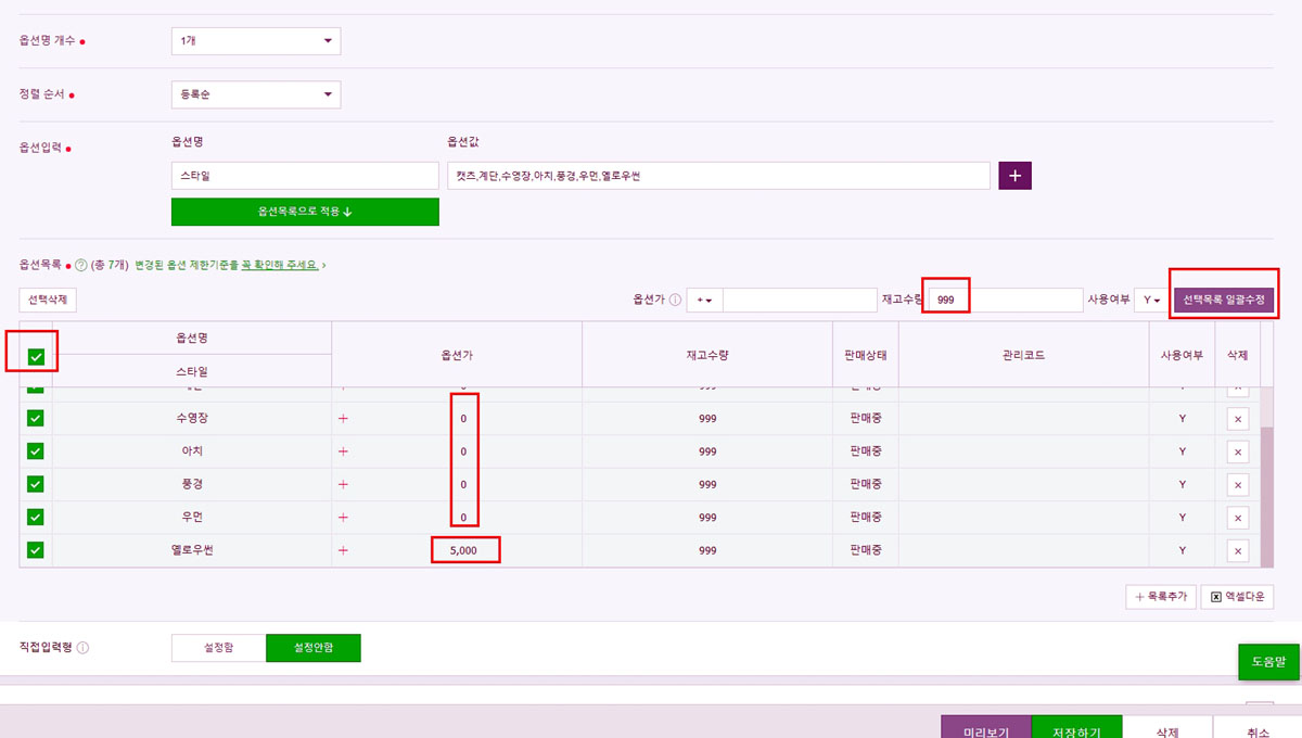 [재고수량]에 999를 입력 후 우측상단의 [선택목록 일괄수정]을 클릭해주세요.