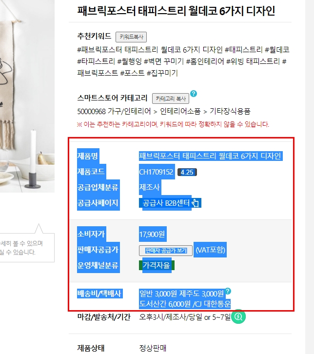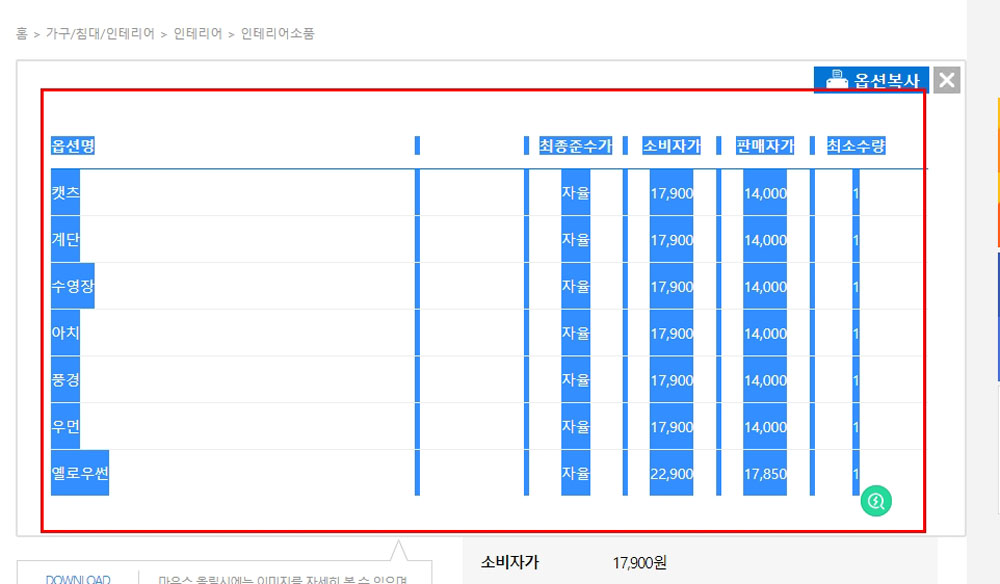 도매사이트에서 제품 상세정보페이지의 제품명부터 택배비 까지 블록을 설정해서 복사하고