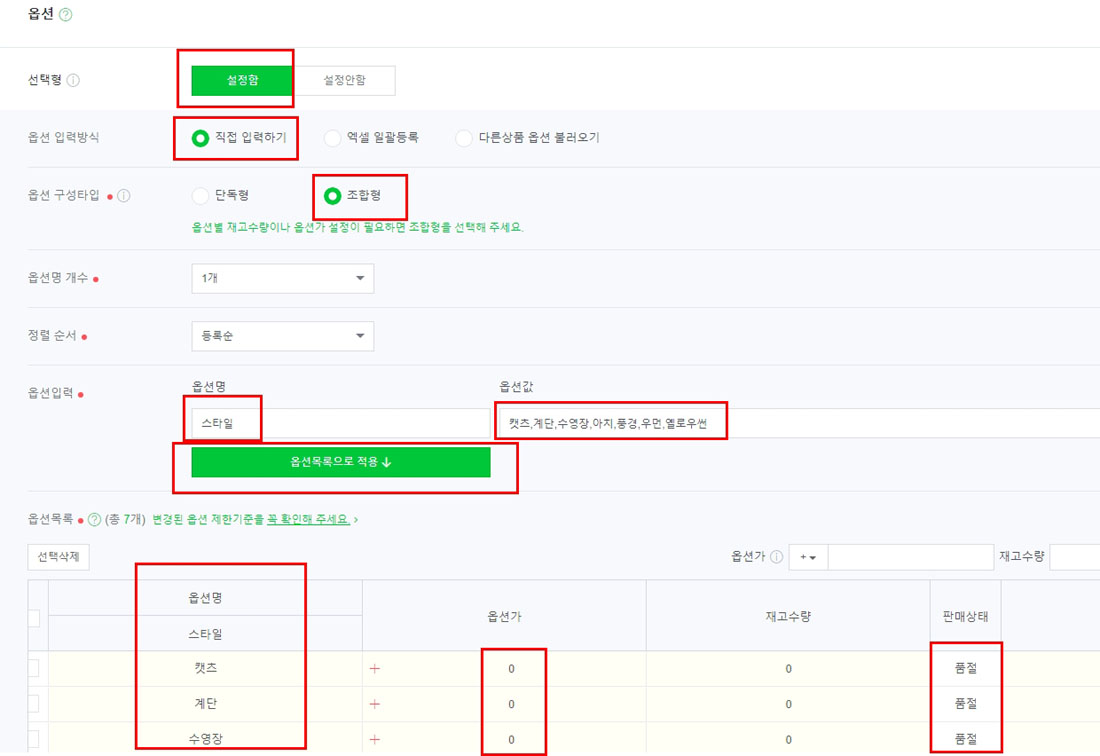 참고로 옵션 중 일부를 재고수량을 0으로 하면 그 옵션은 품절처리가 됩니다.