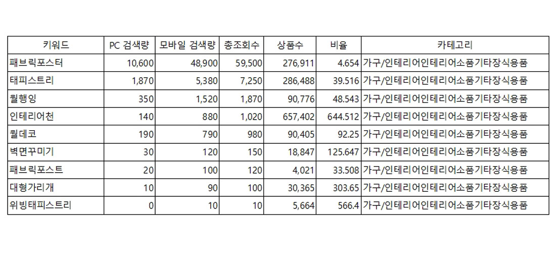 ‘벽면 꾸미기’의 키워드부터 그 아래에 있는 키워드는 카테고리 매칭은 되어있지만 총 검색수가 1,000건이 되지 않아 그냥 버렸어요.