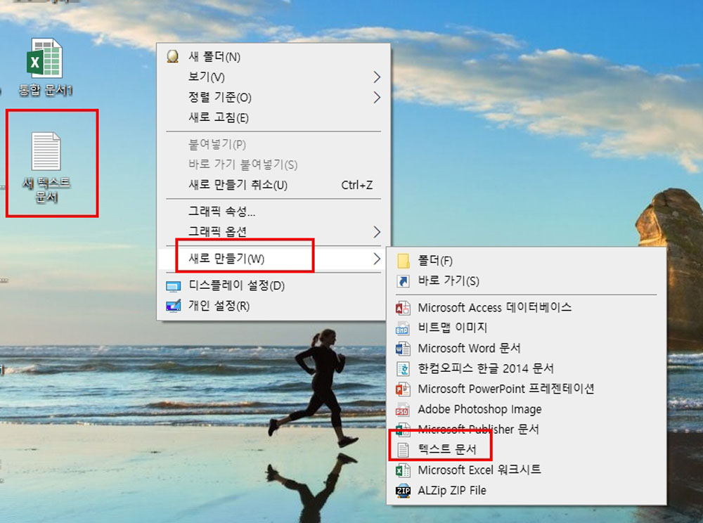 그 다음 PC바탕화면에 마우스 오른쪽 버튼을 클릭하고 [새로 만들기]-[텍스트문서]를 클릭해 메모장 파일을 하나 만들어 주세요.