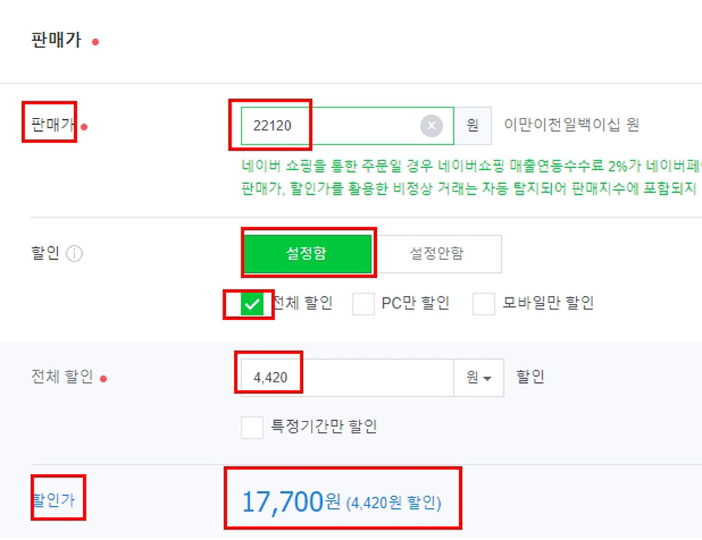 그리고 이제 [할인]에 [설정함]을 클릭하고 [전체할인]에 체크하고 4,420을 입력하니 아래 최종 할인가가 내가 팔고자 했던 금액인 17,700원으로 나옵니다.
