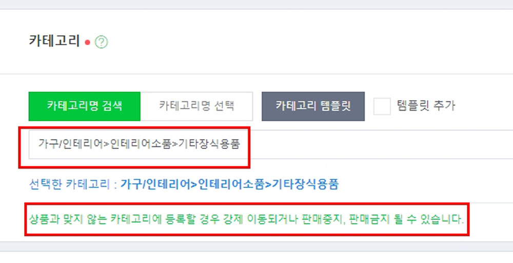 경고문구가 나오는데, “상품과 맞지 않는 카테고리에 등록할 경우 강제 이동되거나 판매중지, 판매금지 될 수 있습니다“라고 아옵니다.