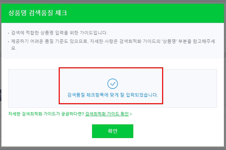 “검색품질 체크항목에 맞게 잘 입력이 되었습니다”라고 나옵니다.