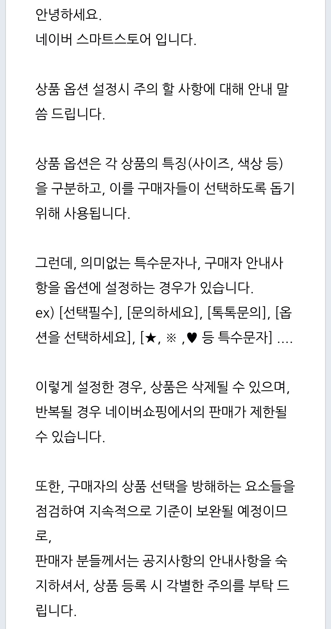 먼저 네이버 스마트스토어 공지사항에 올라온 옵션에 대한 내용을 아래 사진에 올려 드리겠습니다.