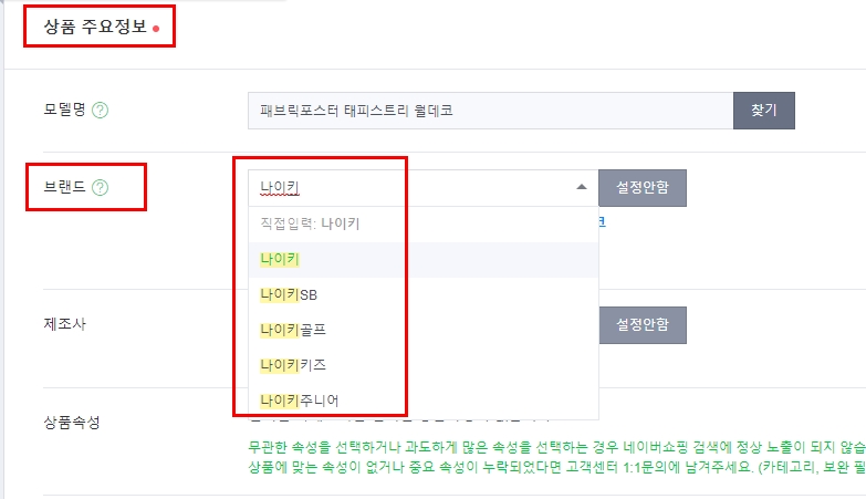 즉, 사람들이 브랜드로 많이 찾는 키워드를 상품명에 넣는 것 보다 아래 사진처럼 [상품 주요정보]-[브랜드]란에 넣어 주는 것이 노출에 더 유리합니다.