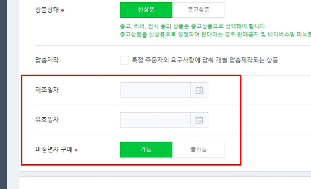 [미성년자 구매]는 미성년자가 구매 할 수 없는 상품(예를 들어 19세 이상 상품이나, 전자담배 등)이라면 불가능으로 체크하고 나머지 상품이라면 가능에 체크해주세요.